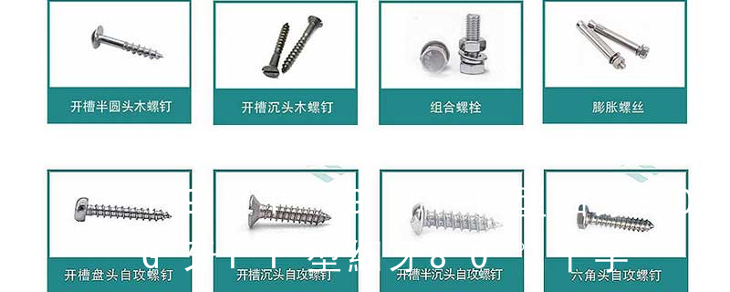 (鐵板牙自攻螺絲) B-2: Plastic Tapping Screw. (塑膠用,自攻螺絲) C: Wooden Screw : 木工螺絲 D: Drywall Screw :水泥墻螺絲 E: Self Drilling Screws鉆尾螺絲(不銹鋼鉆尾螺絲,復合材料鉆尾螺絲) F:膨脹螺絲,四片膨脹螺絲又