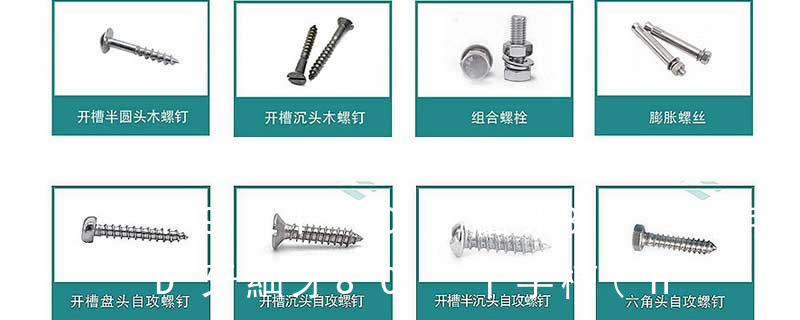 (鐵板牙自攻螺絲) B-2: Plastic Tapping Screw. (塑膠用,自攻螺絲) C: Wooden Screw : 木工螺絲 D: Drywall Screw :水泥墻螺絲 E: Self Drilling Screws鉆尾螺絲(不銹鋼鉆尾螺絲,復合材料鉆尾螺絲) F:膨脹螺絲,四片膨脹螺絲又