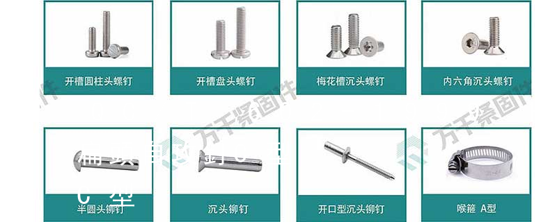 沉頭內六角螺釘(平杯)、半圓頭內六角螺釘(圓杯)、十字槽盤頭機螺釘、十字槽沉頭機螺釘、十字槽大扁頭機螺釘、十字槽盤頭自攻釘、十字槽沉頭自攻釘、十字槽大扁頭自攻釘、全牙絲桿(牙條)、六角螺母、法蘭