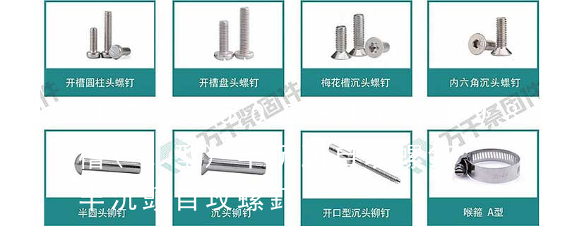 1)十字槽盤頭自鉆自攻螺釘 2)十字槽沉頭自鉆自攻螺釘 3)十字槽半沉頭自鉆自攻螺釘,跟上面沉頭螺絲接近。4)六角法蘭面自鉆自攻螺釘 5)六角凸緣自鉆 自攻螺釘根據材質可分為:鋼材1022A,不銹鐵410,不銹鋼304 自切自攻螺釘有以下幾種型式:十字槽盤頭自切自攻螺釘,十字槽沉頭自切自攻螺釘。十字槽半沉頭自切自攻螺釘,六角頭自切自攻螺釘。 自擠自攻螺釘的螺紋一般為機螺紋,很少采用自攻螺紋。在扳擰方式中,為確保高速自動裝配扳手的使用,一般不推薦